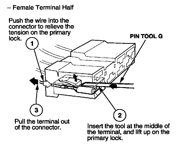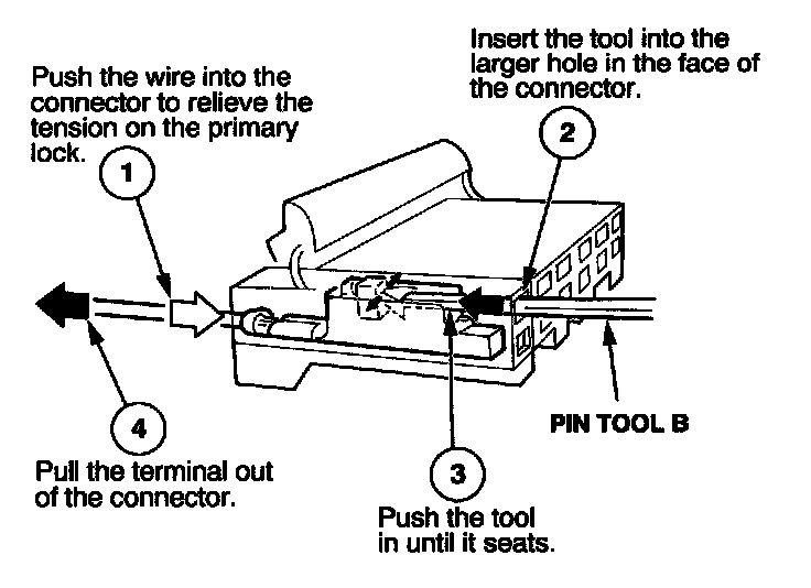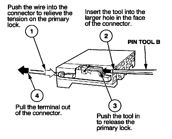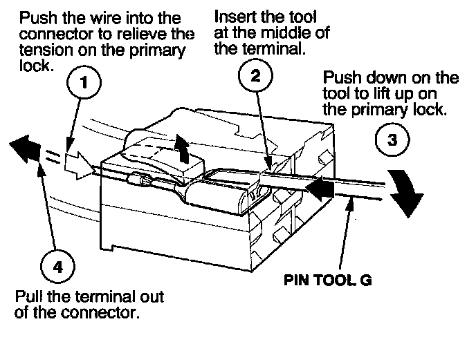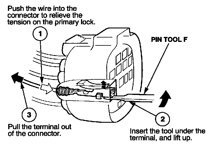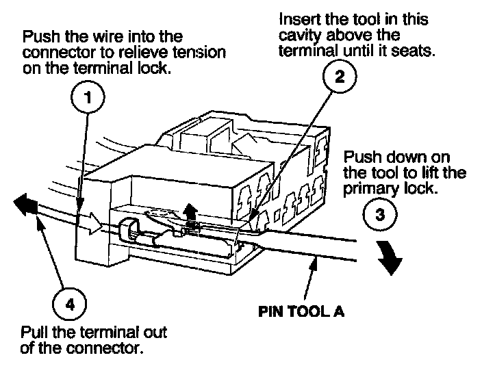 Before you begin, inspect the wire you are about to repair for damage and length. Make sure the wire will be long enough to make a terminal repair without stretching it when you reinstall the terminal in the connector. If the wire is too short, or if access to the connector is too restricted to make a terminal repair, you may need to install a pigtail terminal (a short length of wire with a factory-crimped terminal on it). Refer to HOW TO INSTALL PIGTAIL TERMINALS.