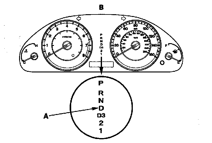 When the powertrain control module (PCM) senses an abnormality in the input or output system, the D indicator (A) in the gauge control module (B) will usually blink.