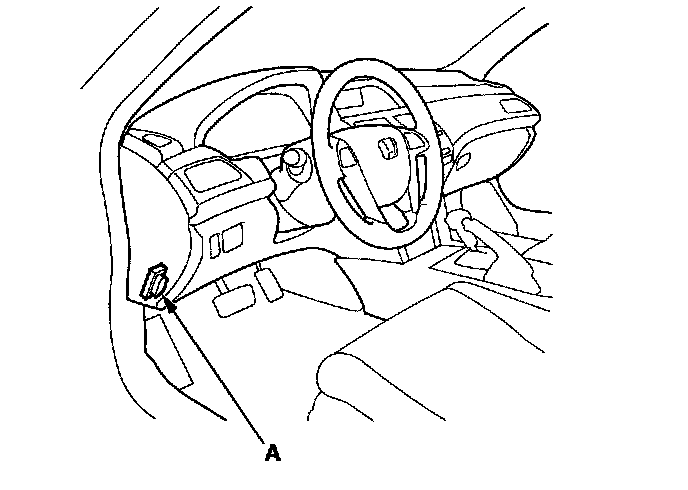 When the Honda Diagnostic System (HDS) is connected to the data link connector (DLC) (A) located under the driver's side of the dashboard, it will indicate the diagnostic trouble code (DTC) when the ignition switch is turned to ON (II) and the appropriate menu is selected.