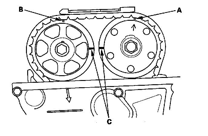 2. Set the No. 1 piston at top dead center (TDC). The punch mark (A) on the variable valve timing control (VTC) actuator and the punch mark (B) on the exhaust camshaft sprocket should be at the top. Align the TDC marks (C) on the VTC actuator and the exhaust camshaft sprocket.