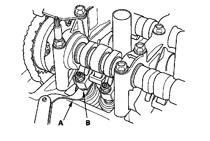 4. Insert the feeler gauge (A) between the adjusting screw (B) and the end of the valve stem, and slide it back and forth; you should feel a slight amount of drag.