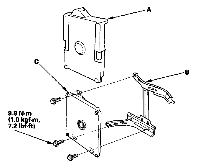 10. Remove the cover (A) and the bracket (B) from the ECM/PCM (C).