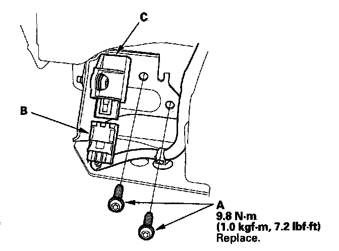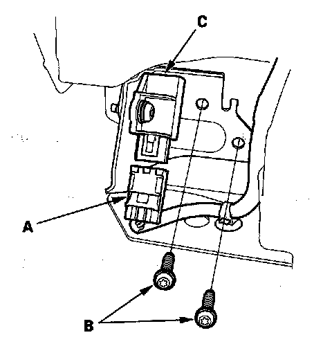 1. Install the front impact sensor with a new TORX bolts (A), then connect the left or right engine compartment wire harness 2P connector (B) to the front impact sensor (C).