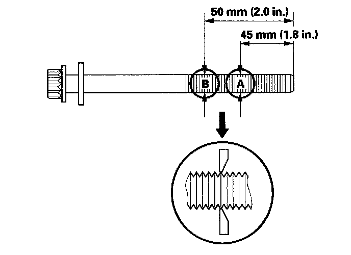 Measure the diameter of each cylinder head bolt at point A and point B.