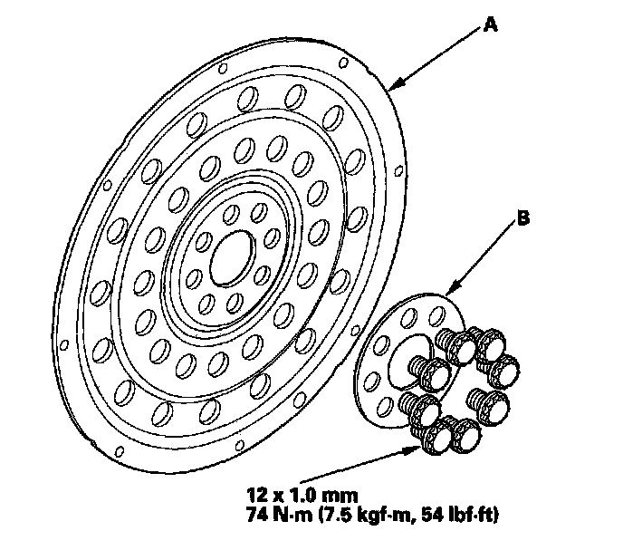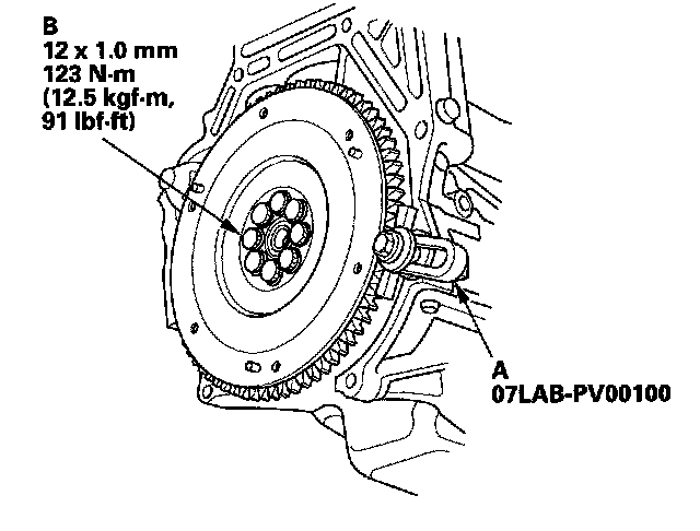 Torque the flywheel mounting bolts (B) in a crisscross pattern in several steps.