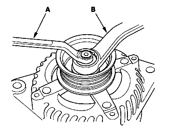 3. If the front bearing needs replacing, remove the pulley locknut with a 10 mm wrench (A) and a 22 mm wrench (B). If necessary, use an impact wrench.