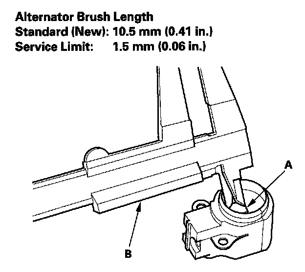 13. Measure the length of both brushes (A) with a vernier caliper (B).