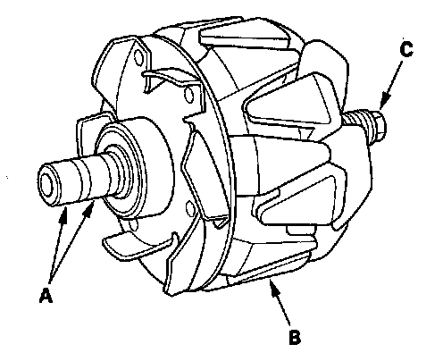 15. Check for continuity between each slip ring and the rotor (B) and the rotor shaft (C).