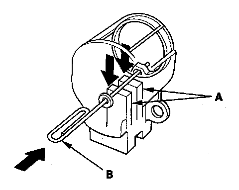 19. Push the brushes (A) in, then insert a pin or drill bit (B) (about 1.6 mm (0.06 in.) diameter) to hold them there.