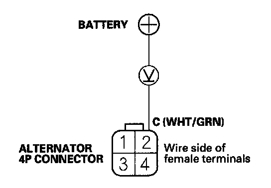 7. Measure the voltage between alternator 4P connector terminal No. 2 and the positive terminal of the battery.