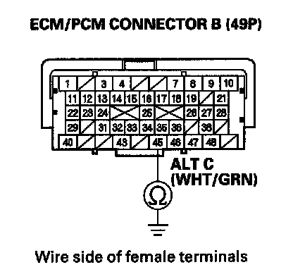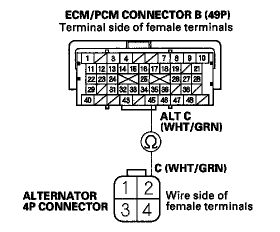 13. Check for continuity between ECM/PCM connector terminal B45 and alternator 4P connector terminal No. 2.