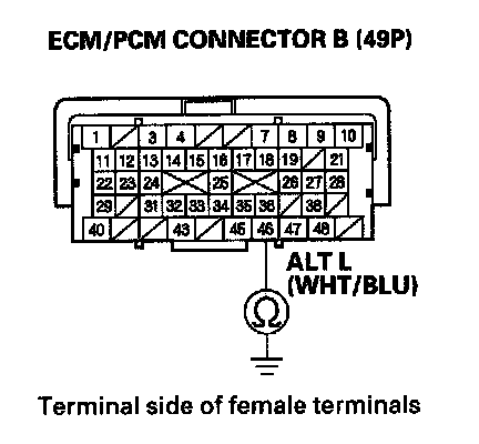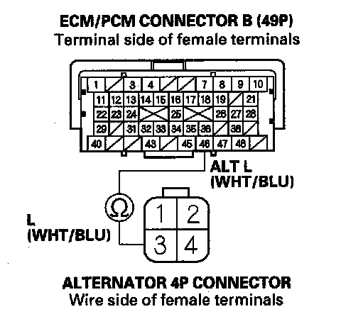 24. Check for continuity between ECM/PCM connector terminal B46 and alternator 4P connector terminal No. 3.