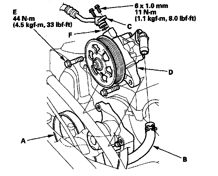 5. Remove the pump mounting bolts (E).