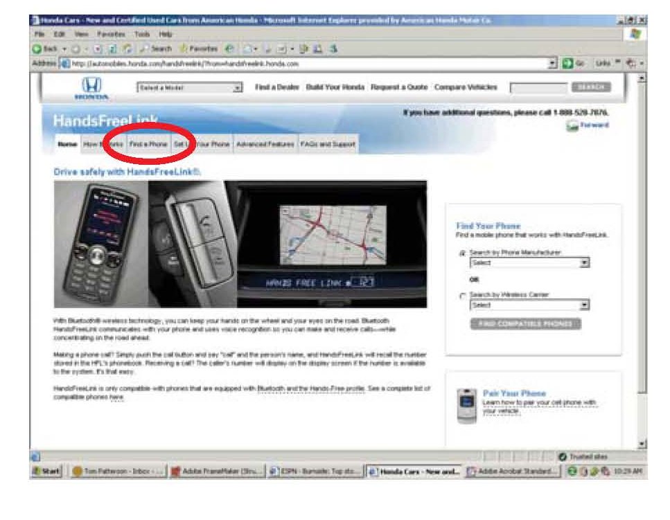 6. Click on the phone model the customer is using to view the HandsFreeLink supported features.