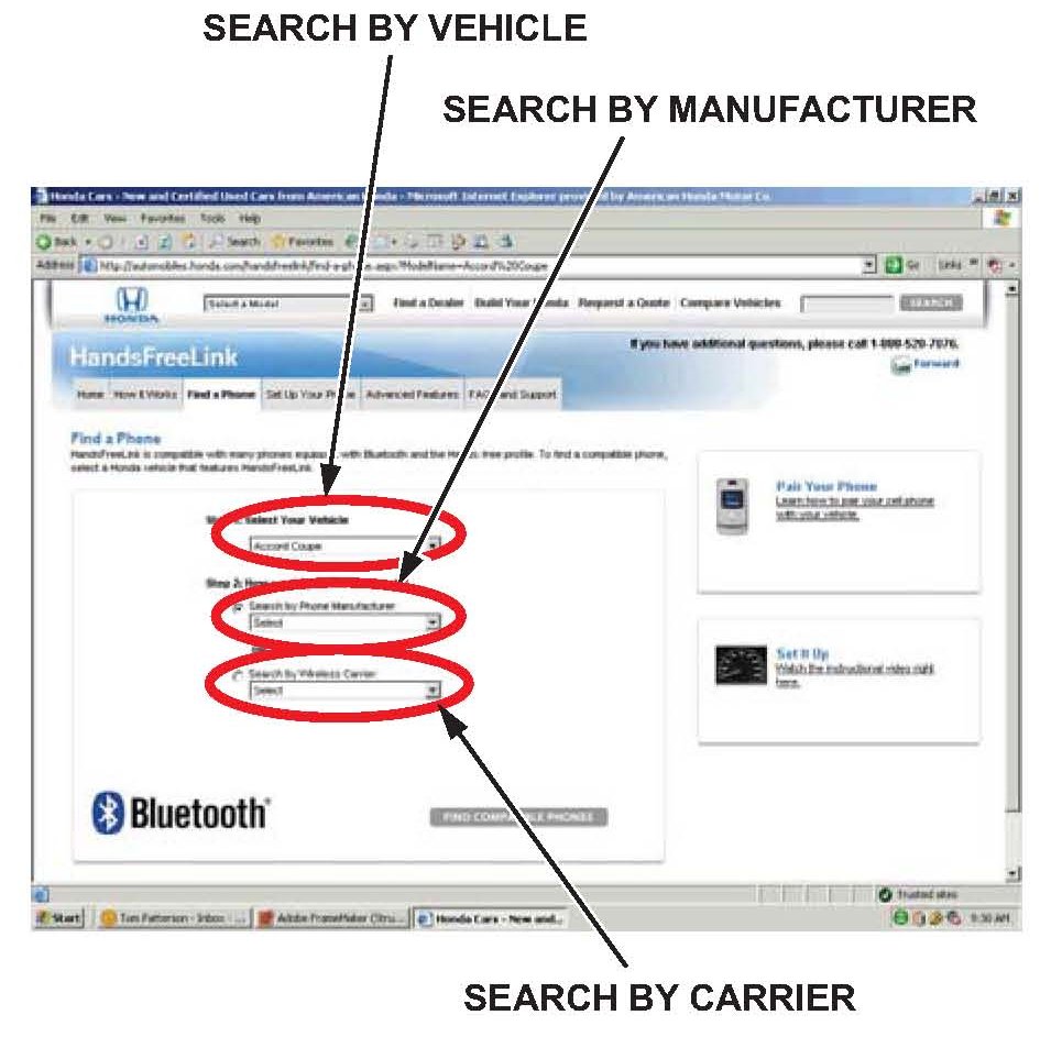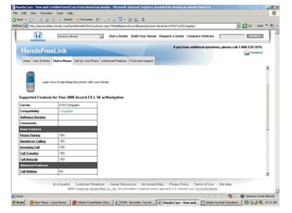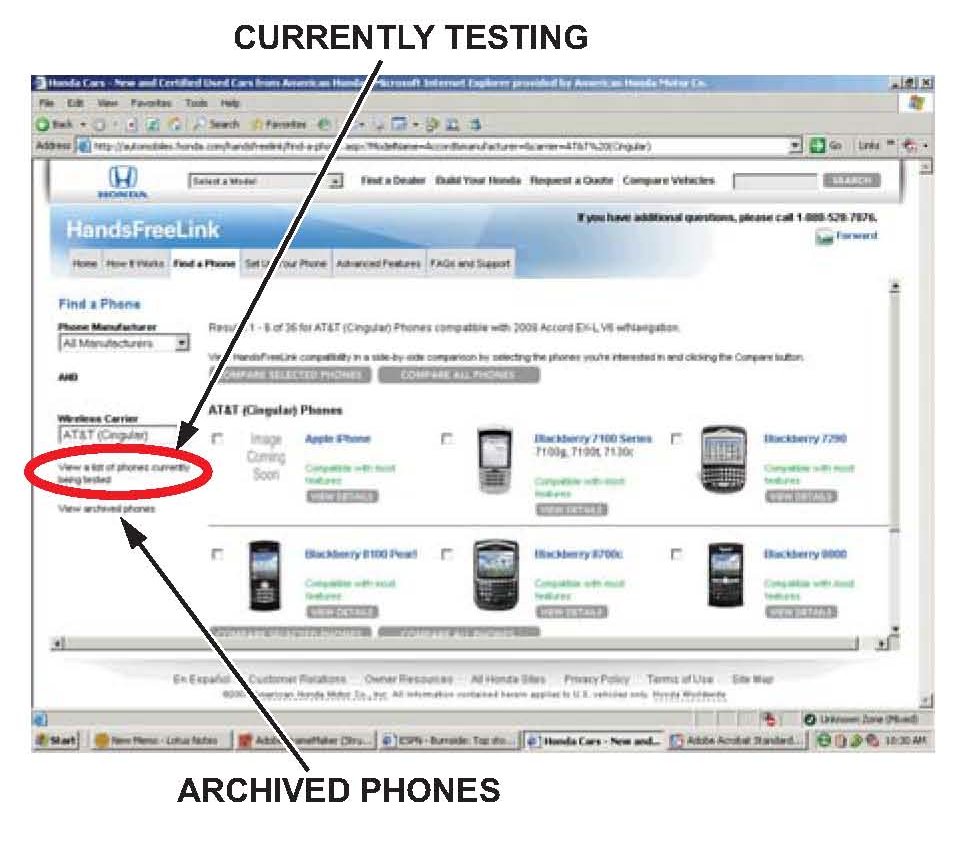 5. A list of all current phone models that have been tested with the Honda HFL system appears. If the phone you are using is not in this list, look under the Currently Testing list and the Archived Phones list.