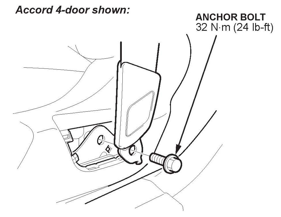 33. Reinstall the seat belt lower anchor bolt, and torque it to 32 N.m (24 lb-ft).
