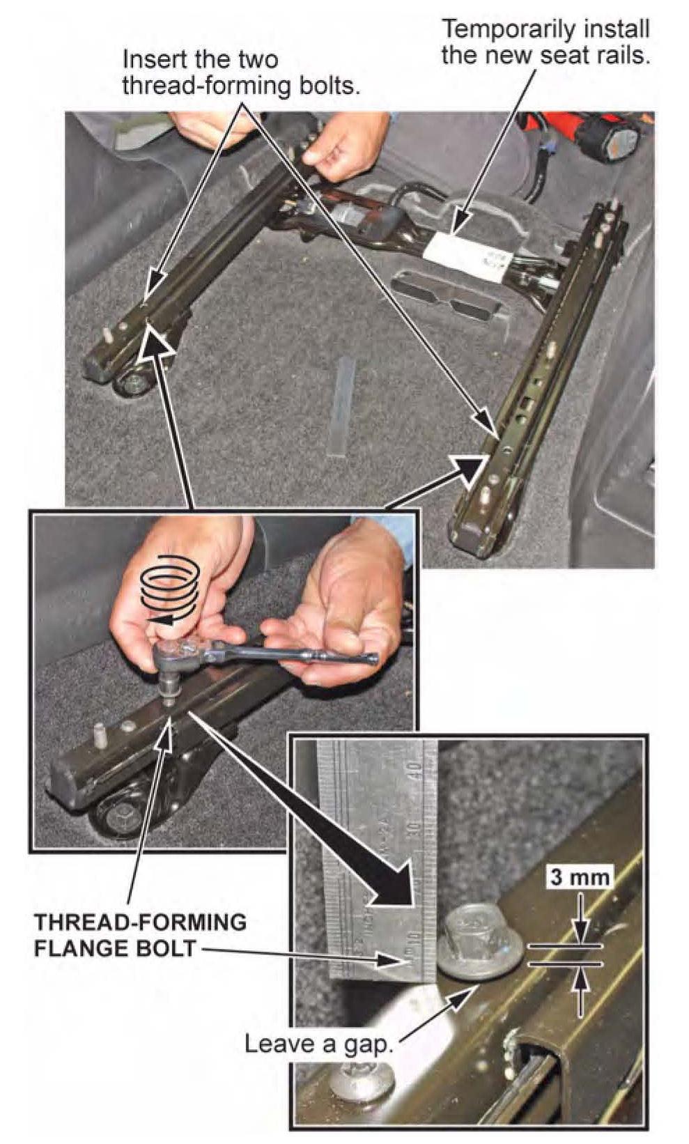 21. Install the new thread-forming flange bolts into the seat track leaving a 3 mm gap from the base of the bolt head. (Do not torque the bolts all the way down.) Do not use air or electric tools.