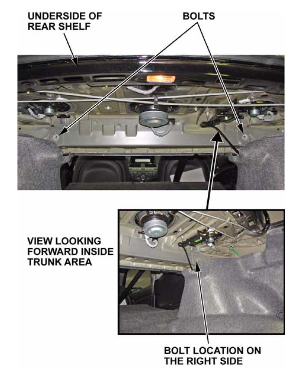 ^ If the noise is coming from the rear shelf, open the trunk, look through the hole next to the trunk light, and check the rear shelf's middle mounting hook for felt tape. If there is no felt tape, see Service Bulletin 08-083, Hear Shelf Rattles When the Vehicle Is Driven on Rough Roads.