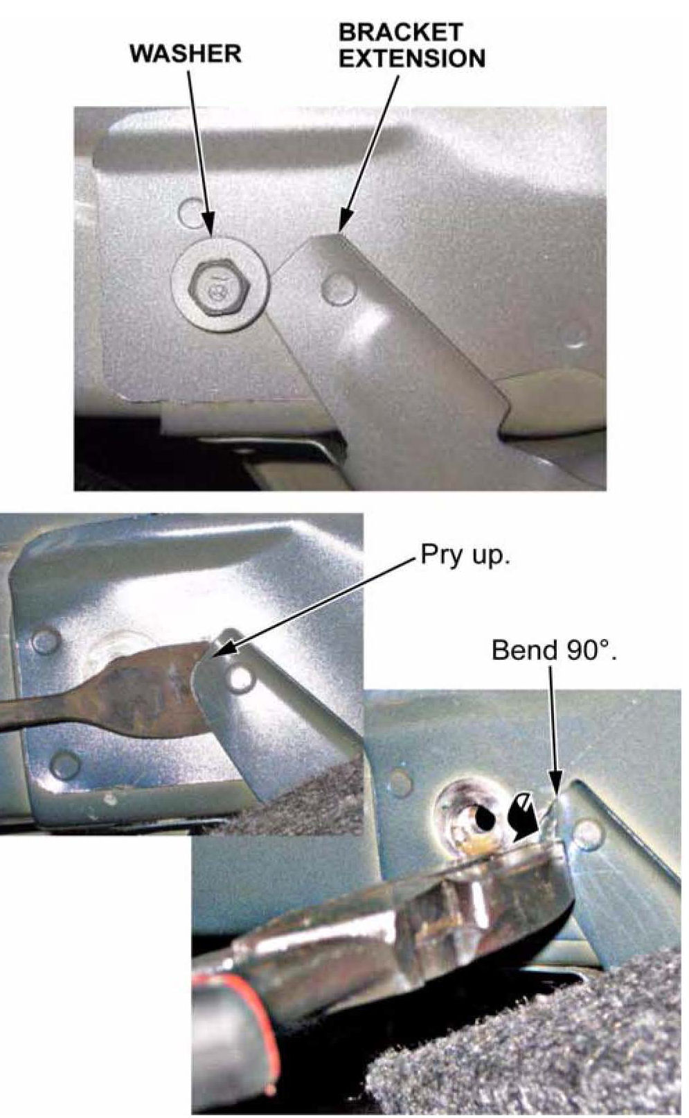 ^ If the bracket extensions are touching the washers, remove the bolts. Then use a hammer and a flat tip screwdriver to pry up on the bracket extensions. Continue bending the edge of the bracket extensions 90 degrees using pliers, so they don't touch the washers. Go to step 4.