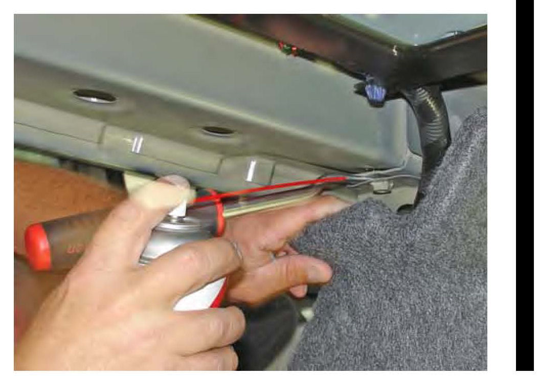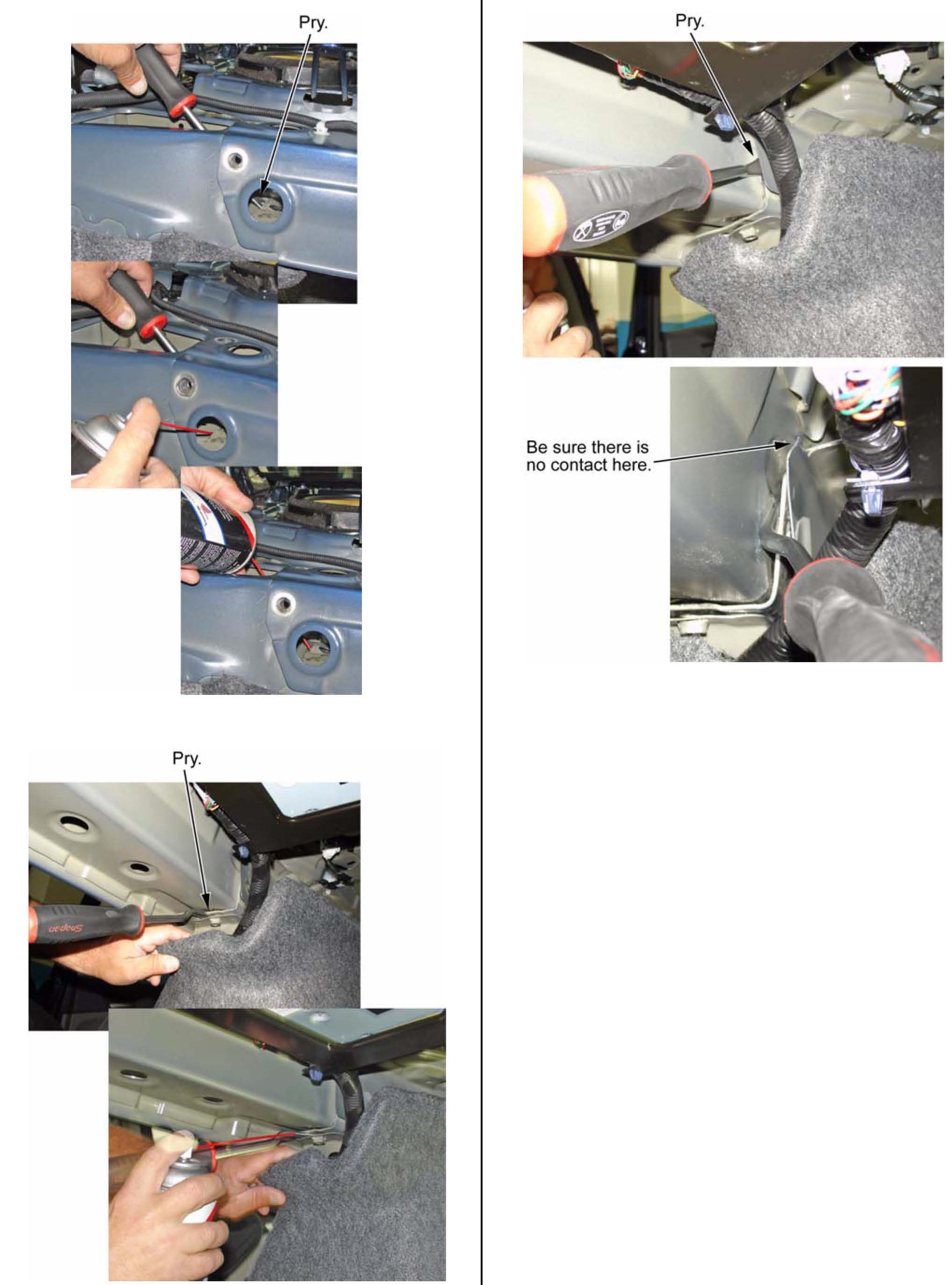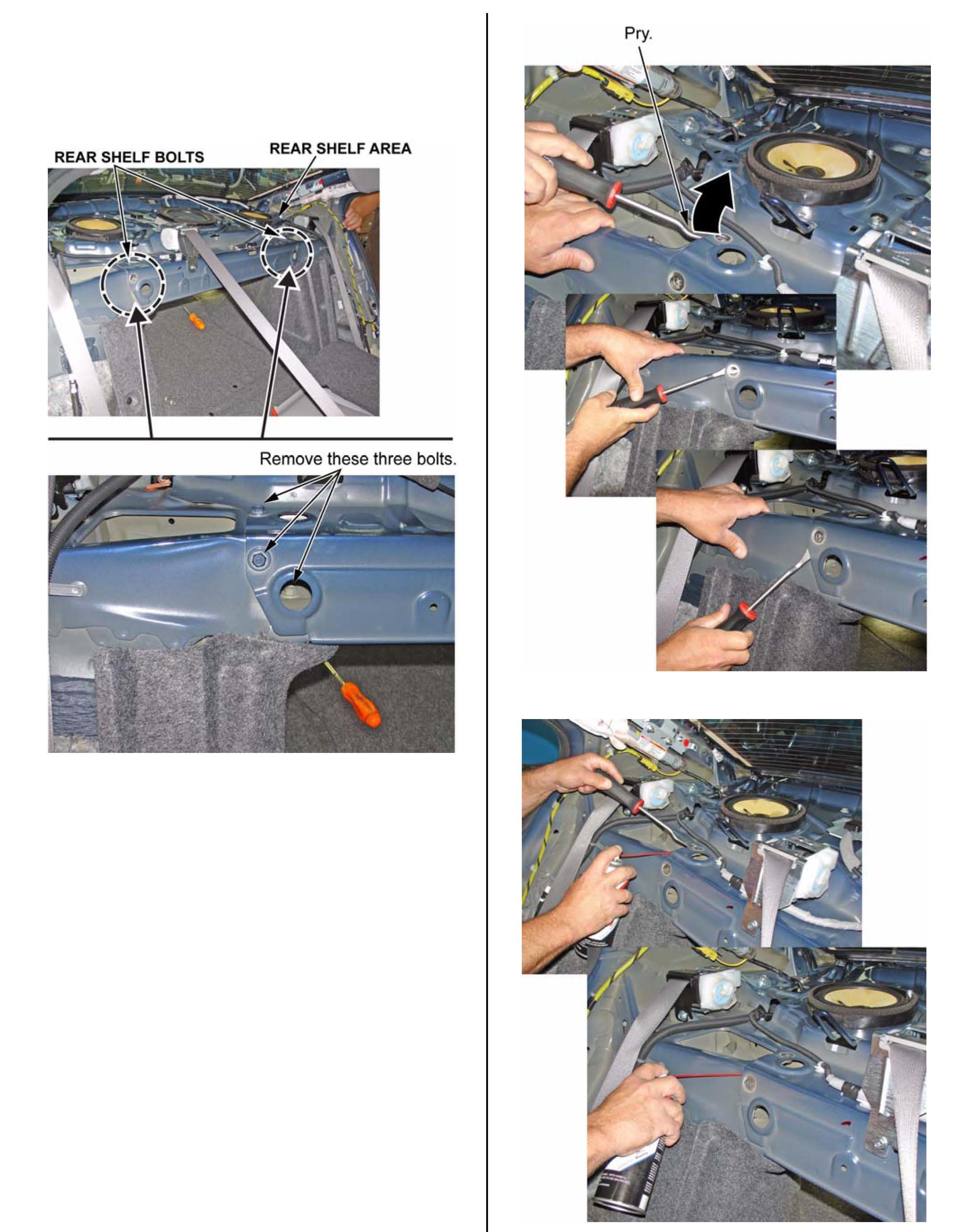 The remaining illustrations show areas that can cause squeaking in the rear shelf area. Use a hammer and screwdriver to pry apart the metal panels, then spray motorcycle chain lube between the panels.