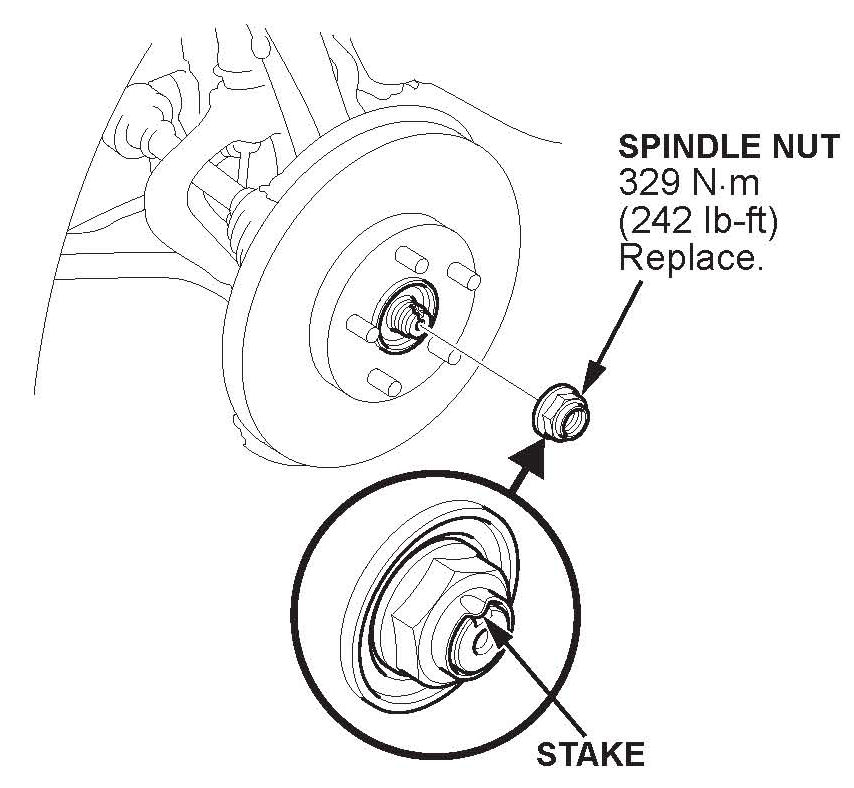 ^ Before installing the spindle nut, apply a small amount of engine oil to the seating surface of the nut. After tightening, use a drift to stake the spindle nut shoulder against the driveshaft.