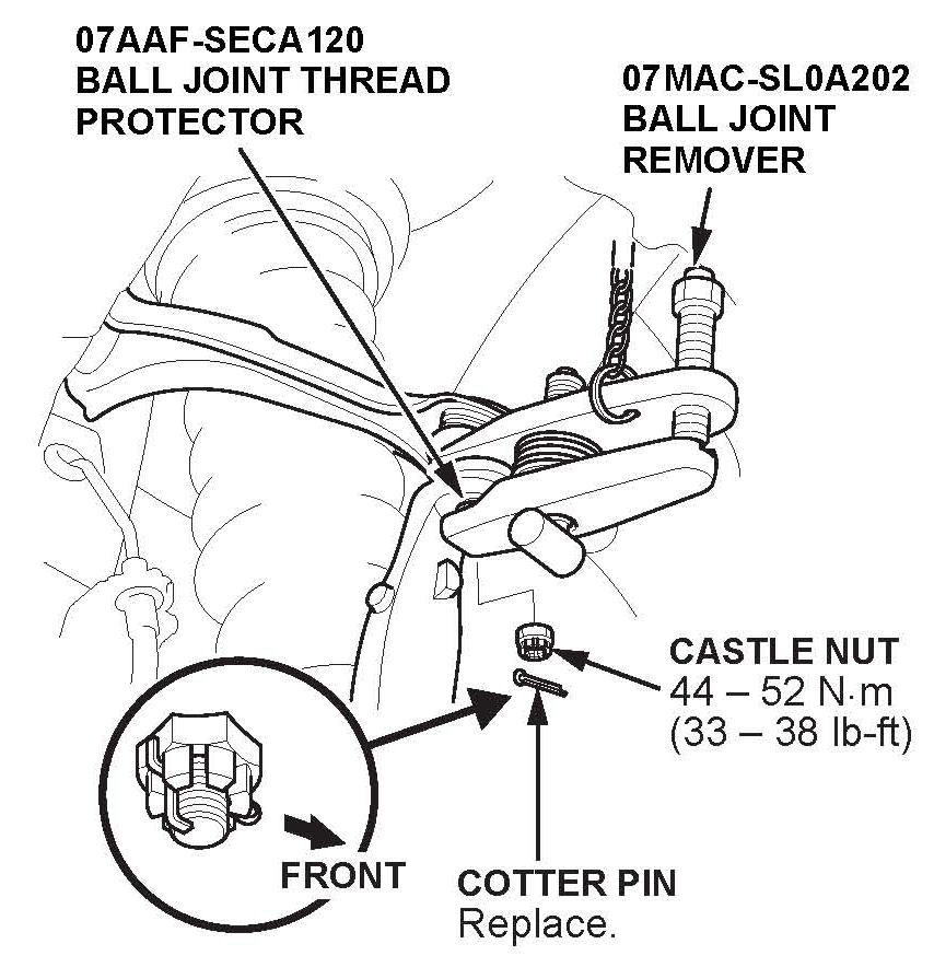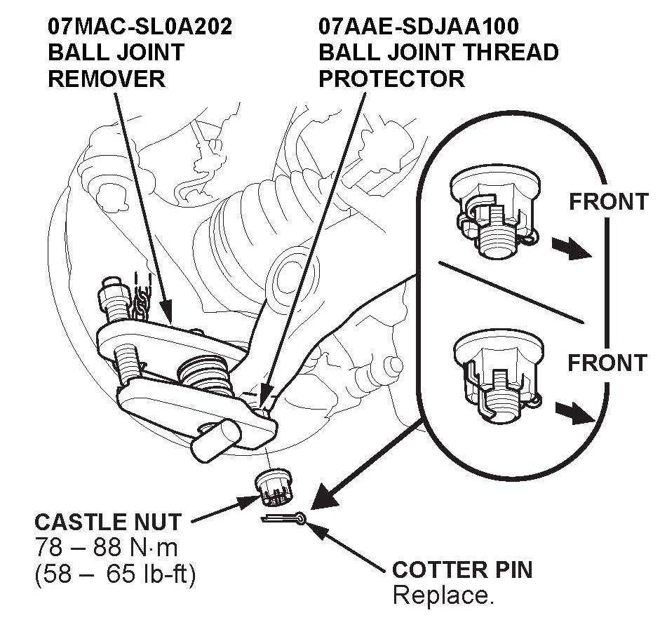 ^ Torque the castle nut to the lower torque specification, then tighten it only far enough to align the slot with the ball joint pin hole. Do not align the castle nut by loosening it.