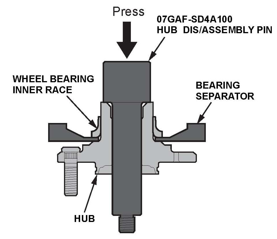 18. Press out the wheel bearing inner race of the hub using the hub dis/assembly pin, a commercially available bearing separator, and a hydraulic press.