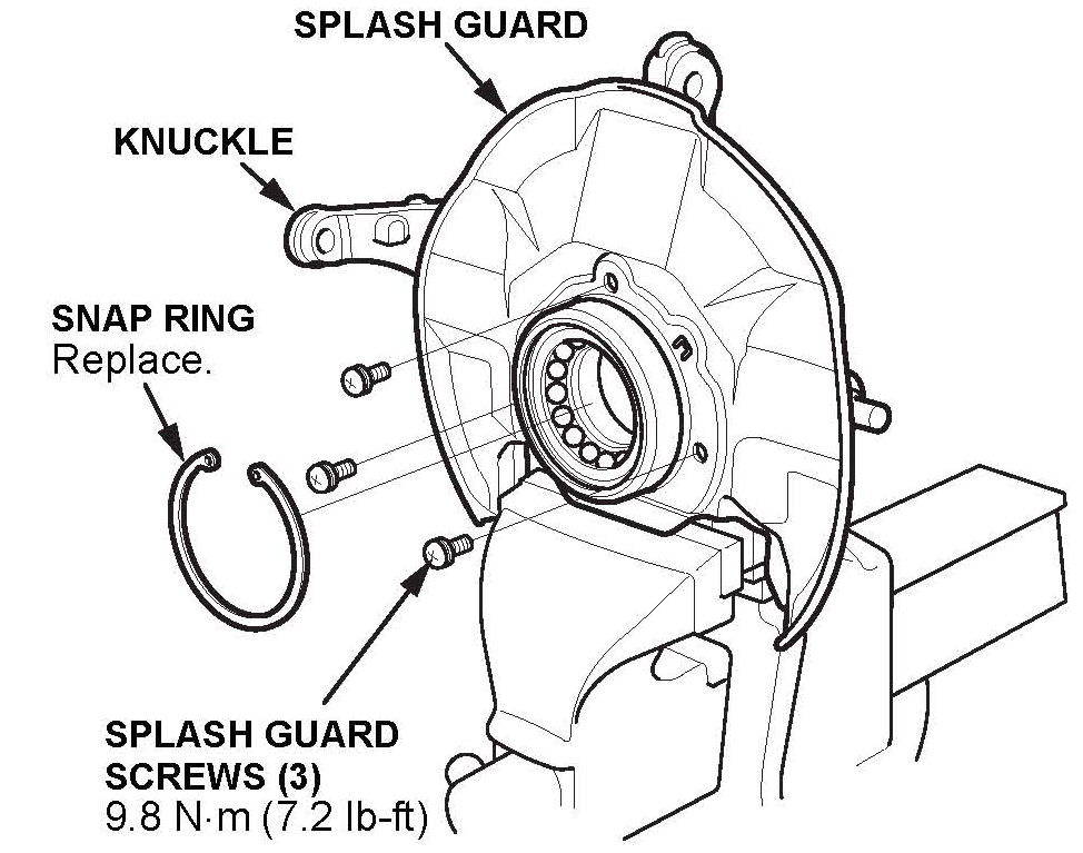 19. Remove the snap ring and the splash guard from the knuckle.