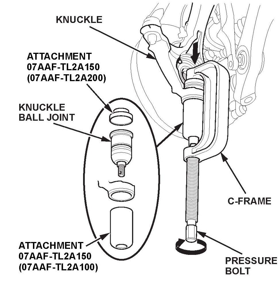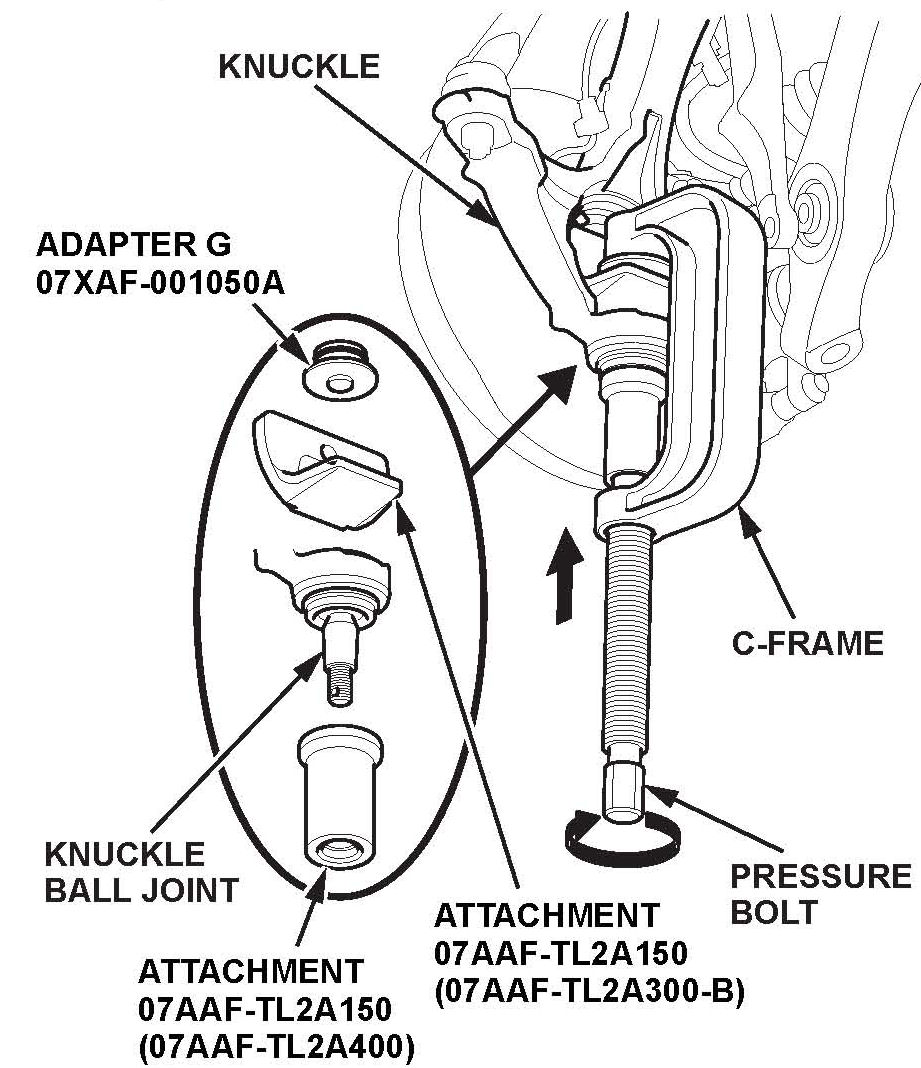 33. Position the ball joint tool kit and the C-frame OTC7248 (commercially available) to the ball joint. Tighten the pressure bolt of the C-frame until the knuckle ball joint shoulder is fully seated in the knuckle.