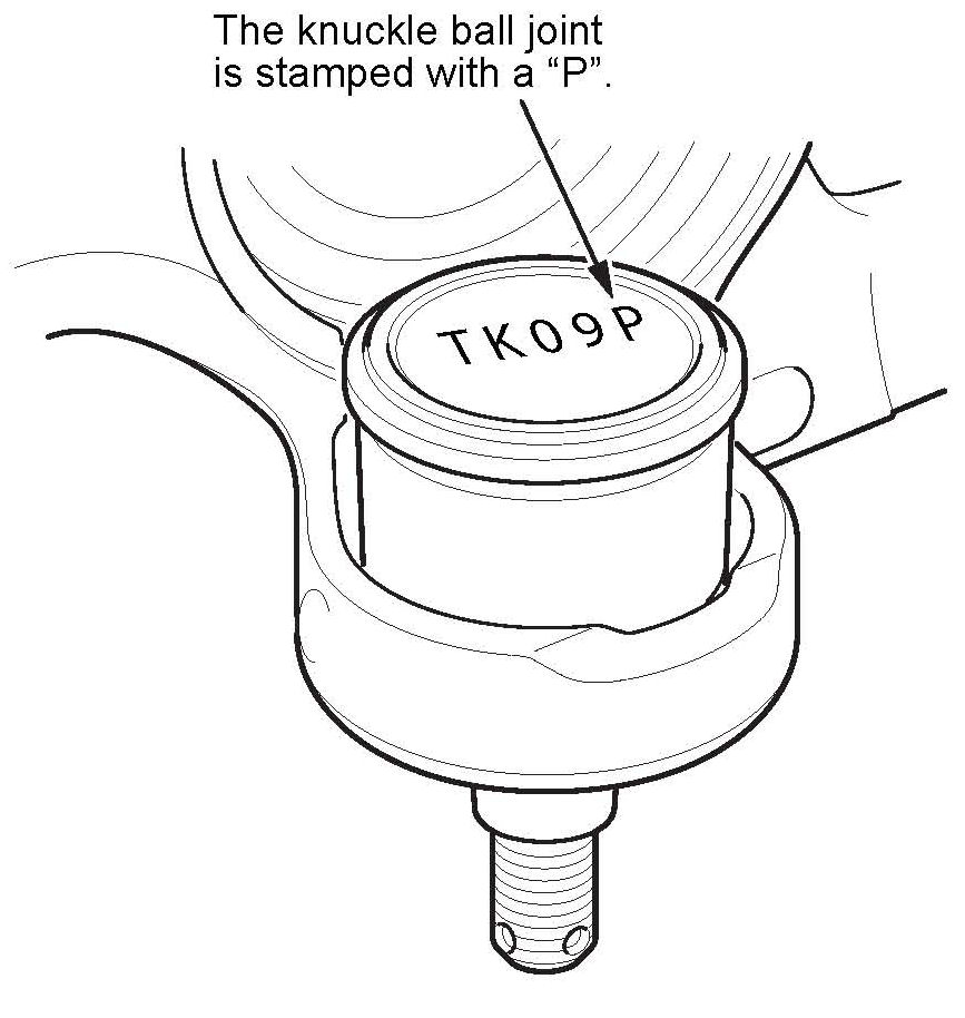 Confirm that the new lower ball joint is stamped with a letter P, indicating a part to resolve clunk noise in high ambient temperature conditions.