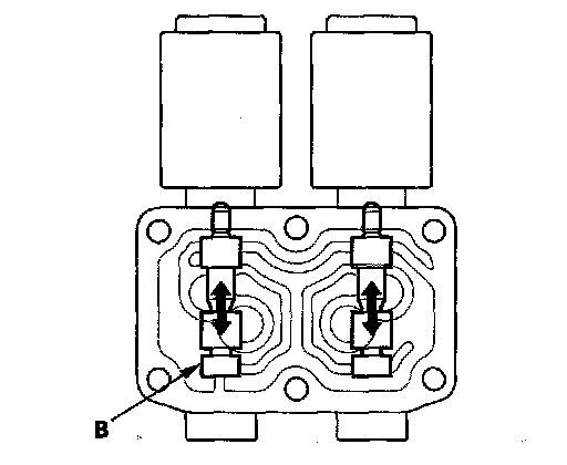 14. Disconnect one of the jumper wires, and check the valve movement at the fluid passage in the valve body mounting surface. If the valve binds or moves sluggishly, or if the solenoid valve does not operate, replace A/T clutch pressure control solenoid valve B and C.