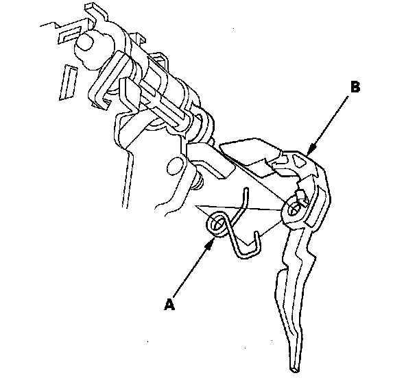 13. Install the shift lock release spring (A) in the shift lock release (B).