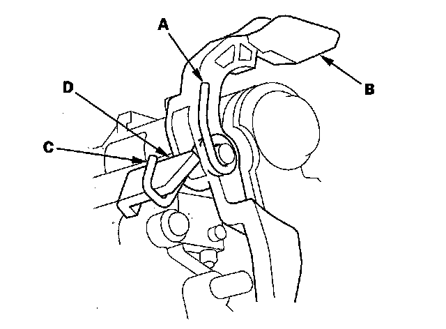 15. Make sure that the release spring end (A) is installed in the shift lock release (B), and the hooked end (C) is on the catch (D).