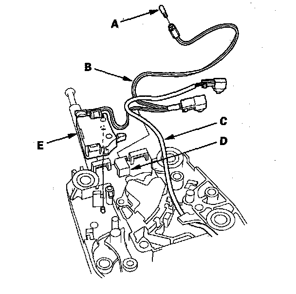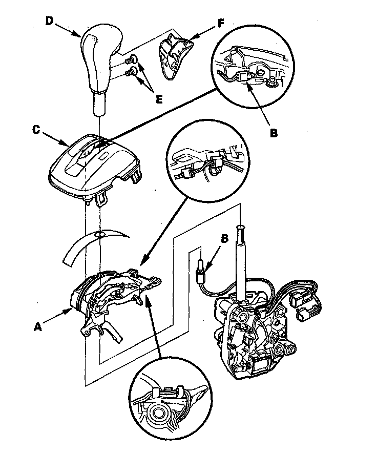 8. Remove the park pin switch/A/T gear position indicator panel light harness (B) and the shift lock solenoid harness (C) from the harness guide (D).