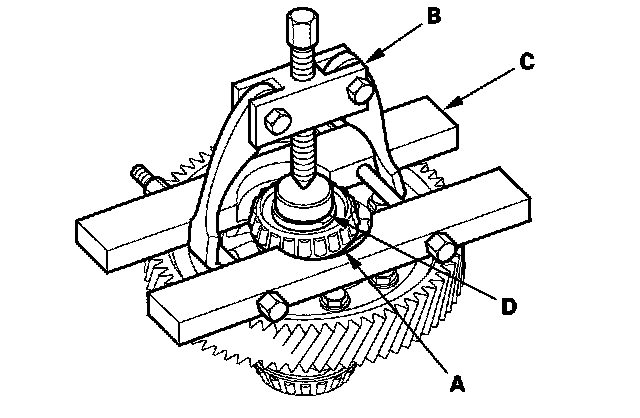 1. Remove the carrier bearing (A) using a commercially available puller (B), a bearing separator (C), and a shaft protector (D).