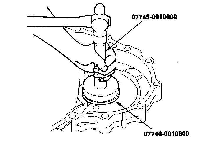 4. Install the bearing outer race securely so there is no clearance between the bearing outer race, the 76.2 mm thrust washer, the 76 mm thrust shim, and the transmission housing, using the driver and the 72 x 75 mm attachment.