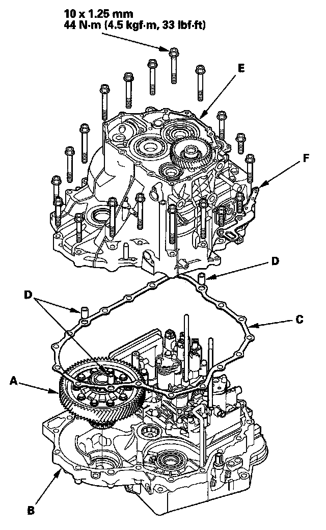 6. Install the transmission housing (E) and the transmission hanger (F), then tighten the bolts.