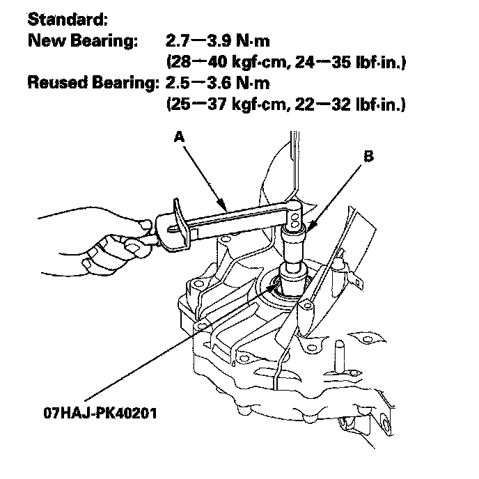 8. Measure the starting torque of the differential assembly in both directions using the preload inspection tool, a torque wrench (A), and a socket (B) at normal room temperature.