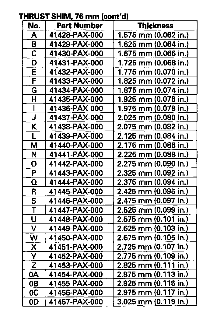 9. If the starting torque is out of standard, remove the 76 mm thrust shim and select a 76 mm thrust shim from table following. Install a new 76 mm thrust shim and recheck. To increase the starting torque, increase the thickness of the 76 mm thrust shim. To decrease the starting torque, decrease the thickness of the 76 mm thrust shim. Changing the 76 mm thrust shim to the next size will increase or decrease starting torque about 0.3-0.4 N-m (3-4 kgf-cm, 2-3 lbf-in.).