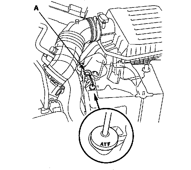 5. Insert the dipstick (A) back into the transmission with the letters "ATF" pointing toward the front of the vehicle.