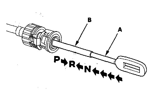7. Push the shift cable (A) until it stops, then release it. Pull the shift cable back one step so that the shift position is in R. Do not hold the shift cable guide (B) to adjust the shift cable.
