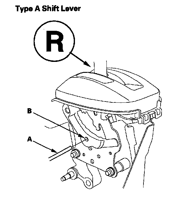 10. Place the shift lever in R, then insert a 6.0 mm (0.24 in.) pin (A) into the positioning hole (B) on the shift lever, through the positioning hole on the shift lever, and into the positioning hole on the bracket. Use only a 6.0 mm pin with no burrs.