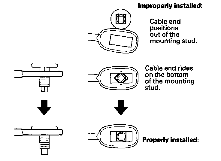 17. If the cable end is out of position on the mounting stud, remove the shift cable from the bracket, and reinstall the shift cable. Do not install the shift cable end on the mounting stud while the shift cable is on the bracket. If the cable end rides on the bottom of the mounting stud, rotate the stud and align the square fitting with the hole.