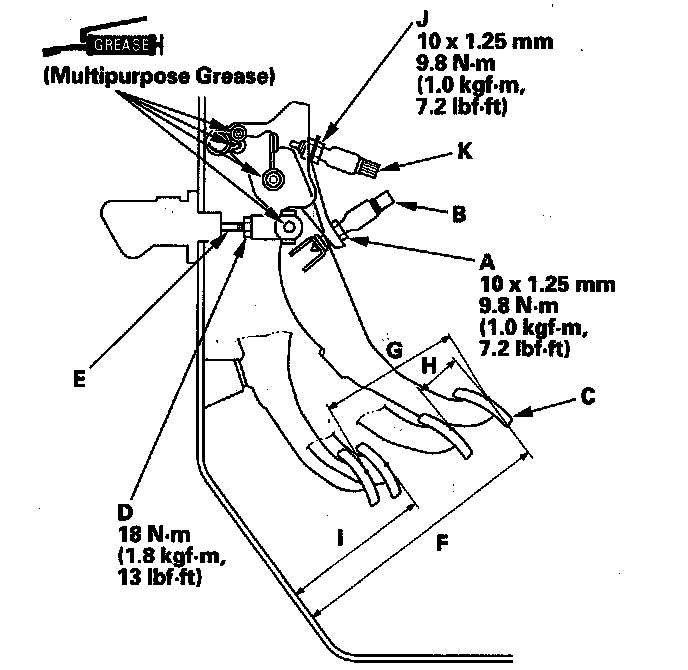 9. Release the clutch pedal 9-12 mm (0.35-0.47 in.) from the fully pressed position, and hold it there. Adjust the position of the clutch interlock switch (K) so the engine will start with the clutch pedal in this position.