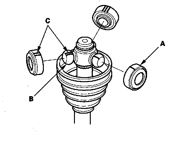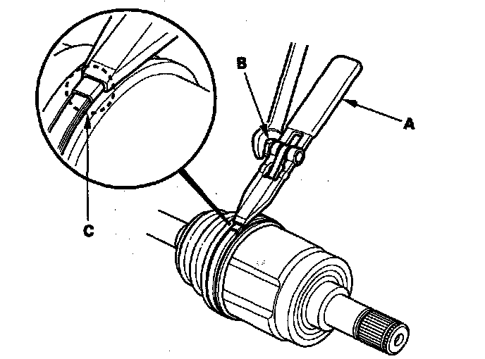 9. Fit the boot ends (A) onto the driveshaft (B) and the outboard joint (C). Bleed any excess air from the boot by inserting a flat-tipped screwdriver between the boot and the joint.