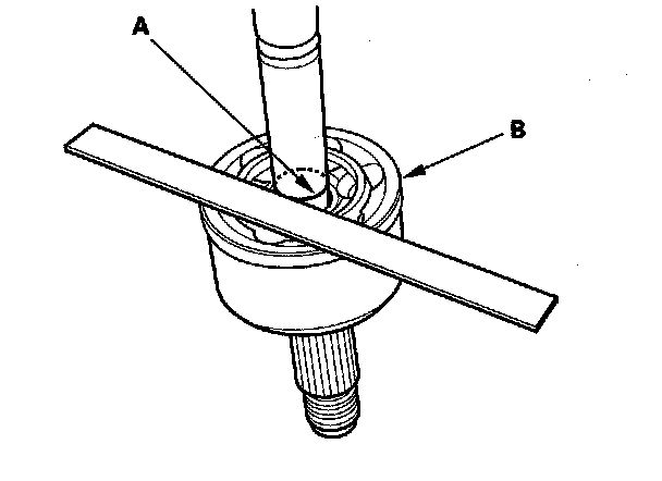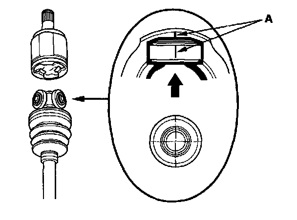 ^ Reinstall the inboard joint onto the driveshaft by aligning the marks (A) you made on the inboard joint and the rollers.