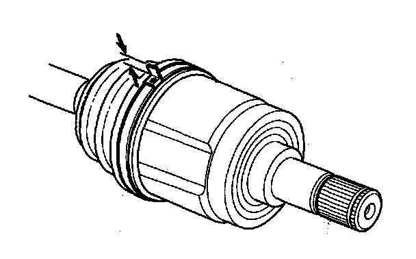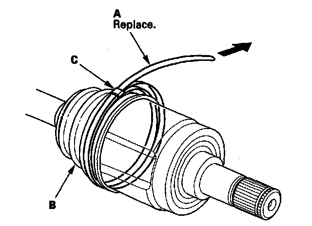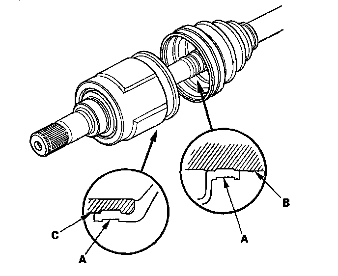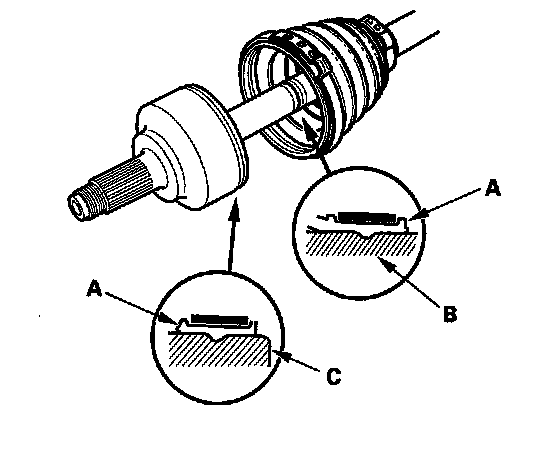 8. Fit the boot ends (A) onto the driveshaft (B) and the inboard joint (C).