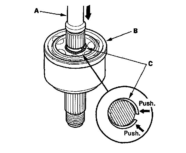 5. Insert the driveshaft (A) into the outboard joint (B) until the stop ring (C) is close to the joint.