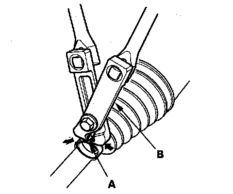 11. Close the ear portion (A) of the band with commercially available boot band pliers Kent Moore J-35910 or equivalent (B).