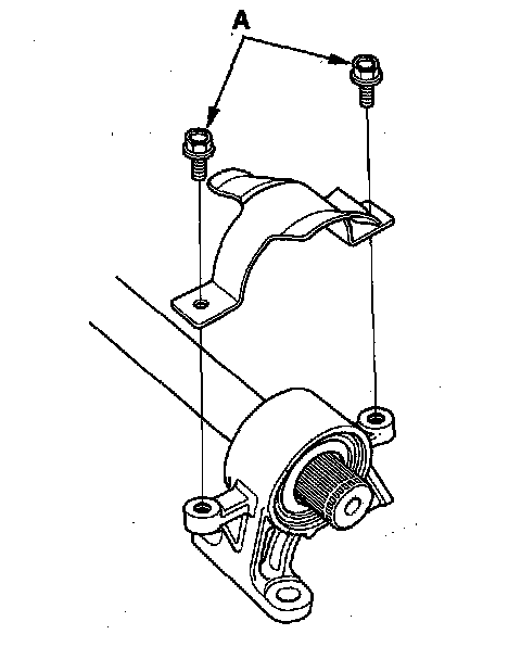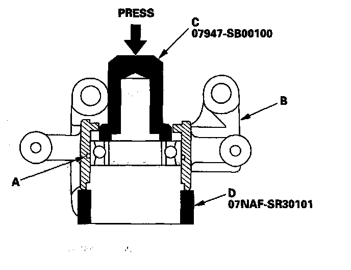 5. Press the intermediate shaft bearing (A) out of the bearing support (B) using the oil seal driver (C), the half shaft base (D), and a press.